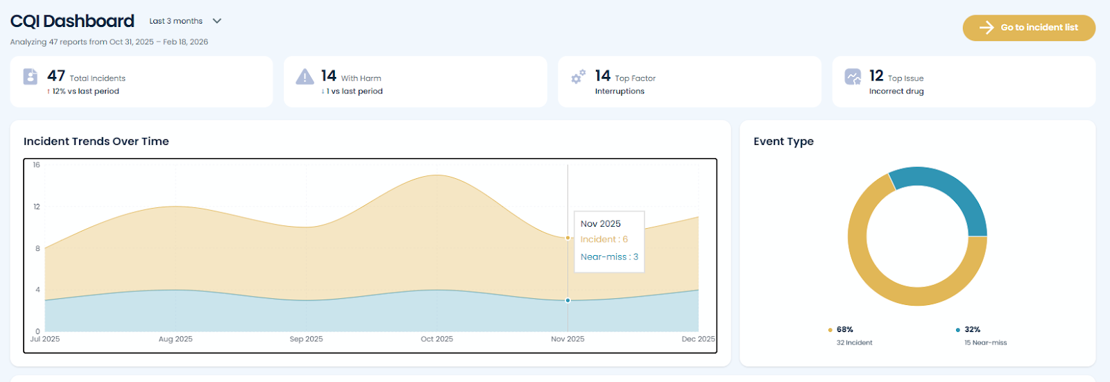 MAPflow's CQI Dashboard gives you a centralized view of incidents in your pharmacy, making it easy to identify trends, measure performance, and take action. Using the date range toggle, you can analyze metrics across different time periods, while MAPflow automatically surfaces comparisons and actionable insights to help your team reduce incidents before they happen.