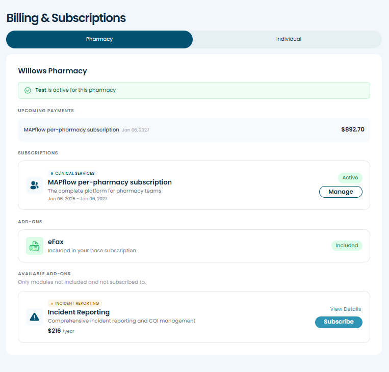 - The per pharmacy subscription is best for pharmacy teams seeking maximum efficiency, who want to leverage MAPflow's full suite of features.